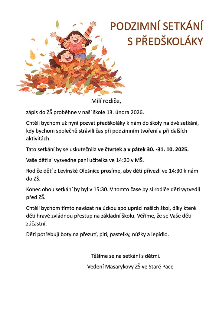 Společně máme snahu o co nejplynulejší přechod dětí ze školy mateřské do té základní a proto Vám vřele doporučuji zapsat se na nástěnkách vašich tříd na toto setkání.